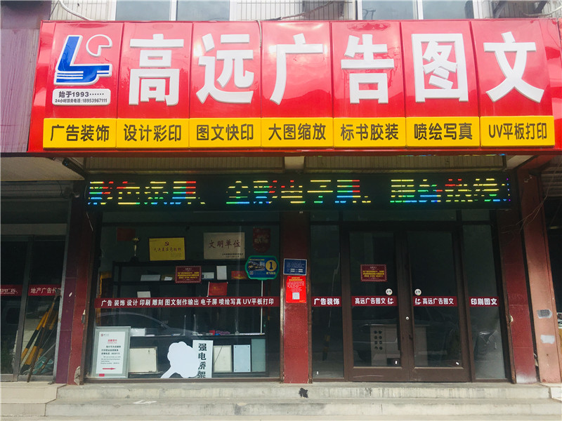 臨沂市高遠(yuǎn)科技廣告印務(wù)裝飾有限公司是一家集廣告制作、室內(nèi)外裝飾、設(shè)計(jì)印刷、人像證卡、雕刻、圖文制作輸出、黑白及彩色電子屏于一體的大型廣告印務(wù)裝飾公司。